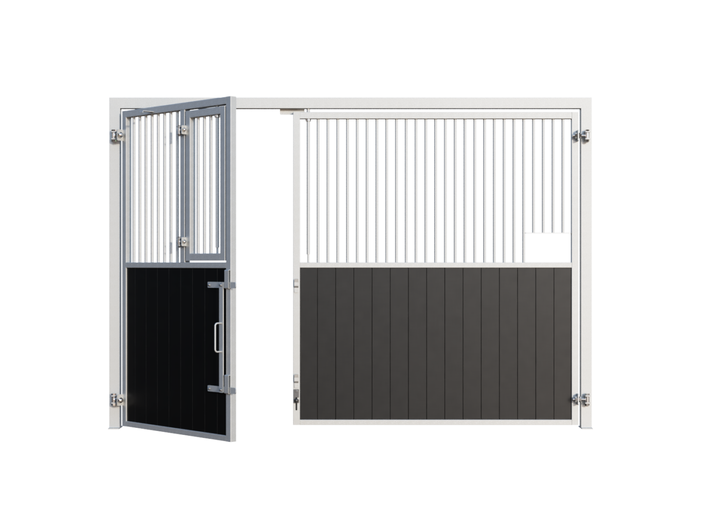 De complete voorwand is draaibaar op stevige scharnieren, waardoor u de stalruimte eenvoudig openzet voor het machinaal leeghalen van de box. De scharnieren worden naar wens links of rechts gemonteerd. Dankzij het versterkte frame behoudt de constructie zijn vorm, ook bij intensief gebruik. De draaideur biedt een brede doorgang en is gemakkelijk te openen, zelfs wanneer u met een paard aan de hand staat.