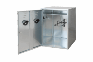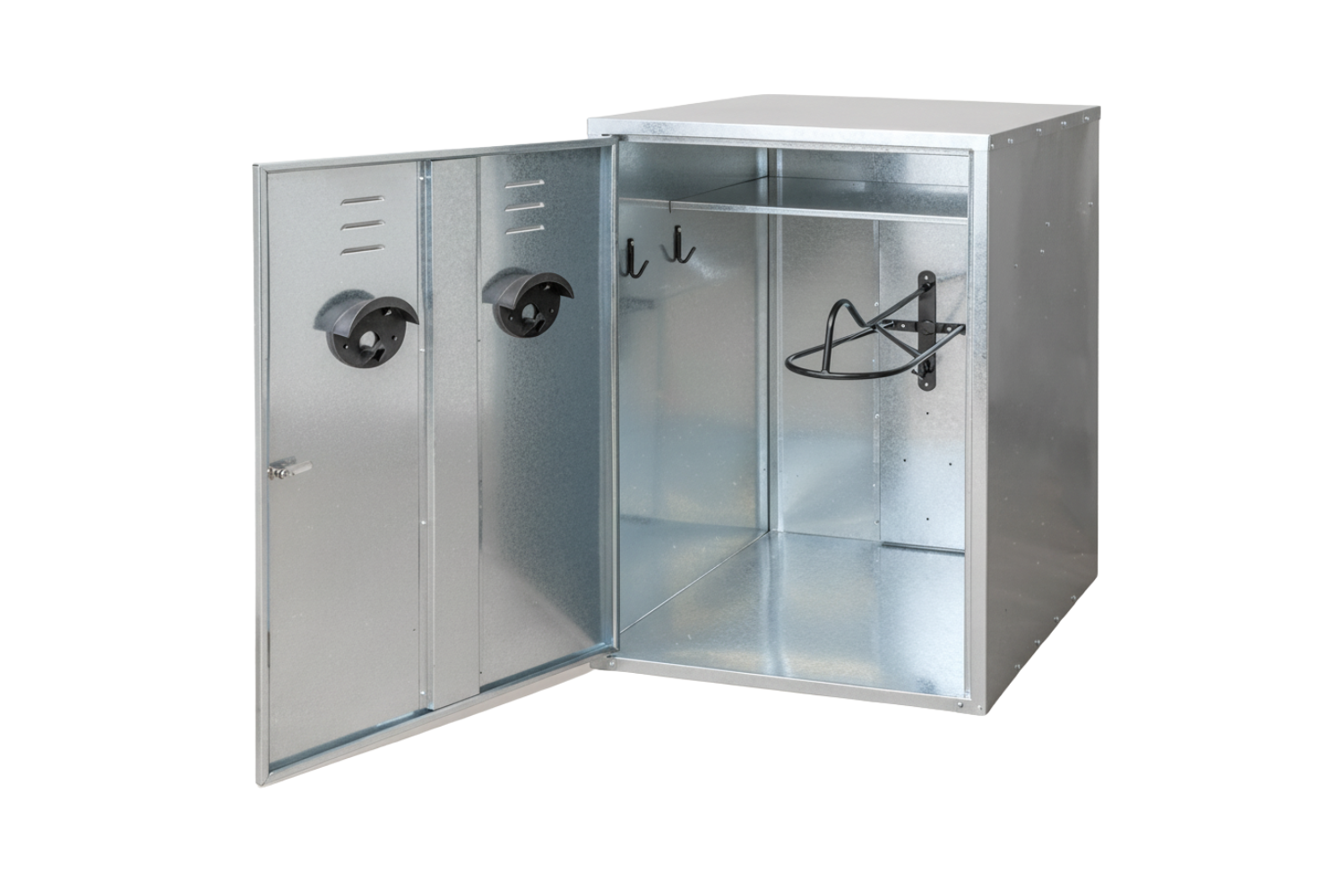 Ondanks zijn formaat biedt model S plaats aan één zadel, twee hoofdstellen en heeft de kast diverse haken en een legplank voor bijvoorbeeld verzorgingsproducten of supplementen. De kast is volledig muisdicht en vervaardigd uit thermisch verzinkt staal, waardoor hij bestand is tegen roestvorming en onderhoudsvrij in gebruik. Dankzij de afgeronde randen worden beschadigingen aan zadels, dekjes of kleding voorkomen.